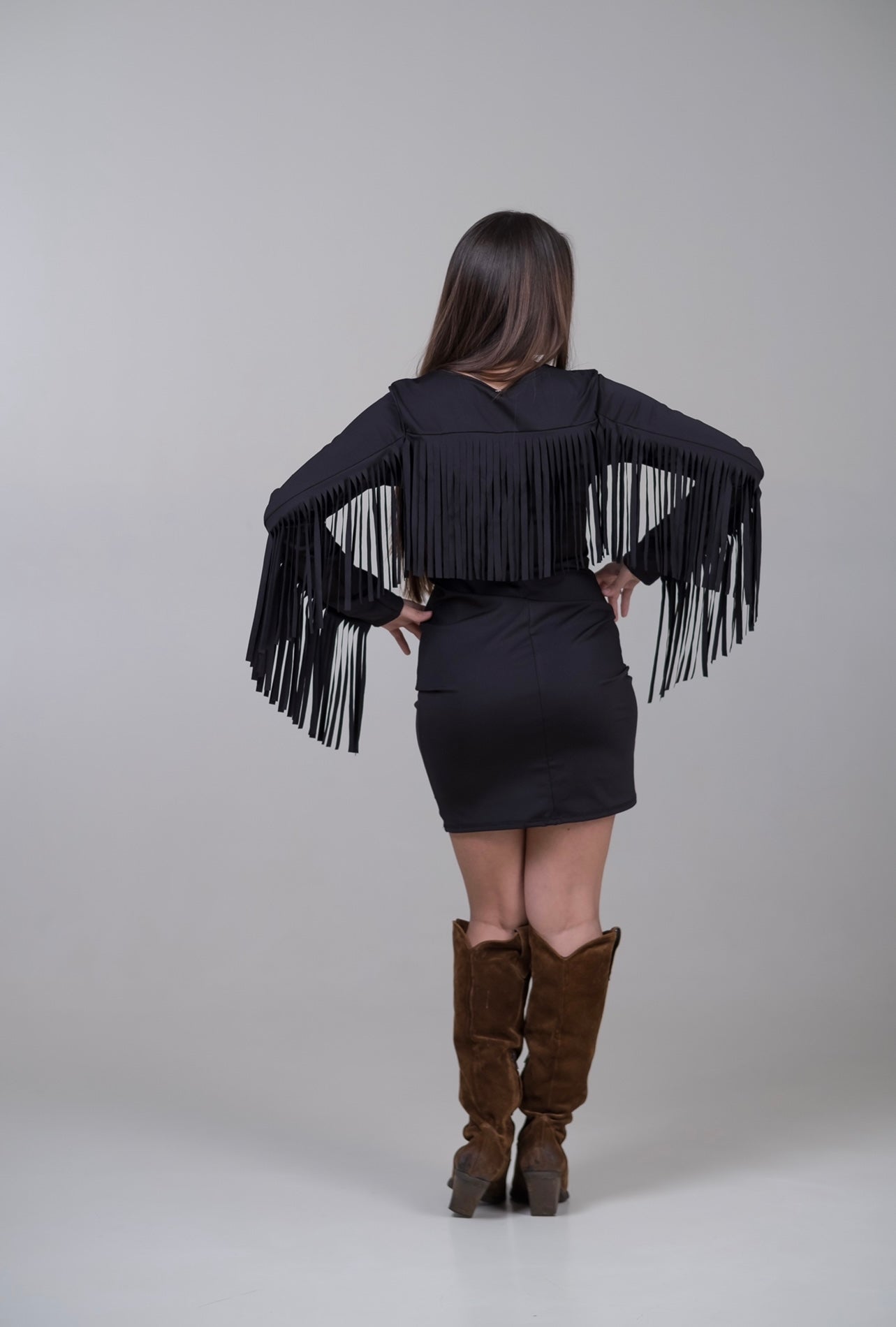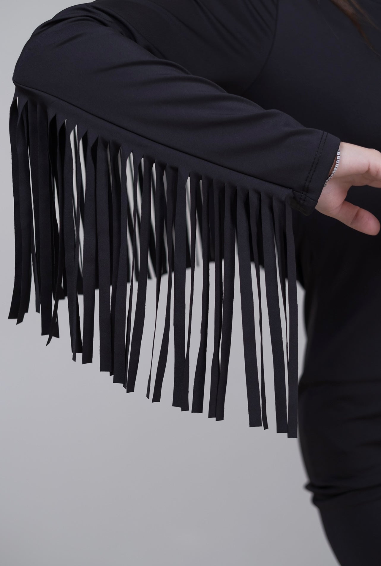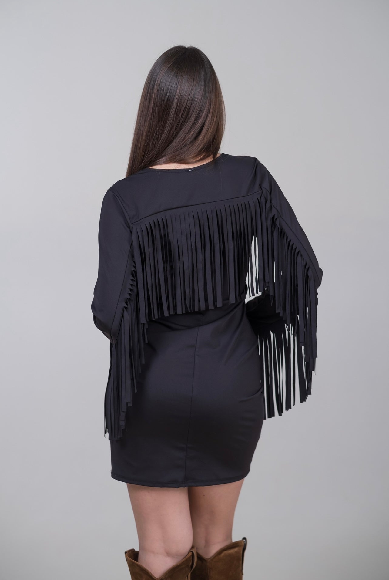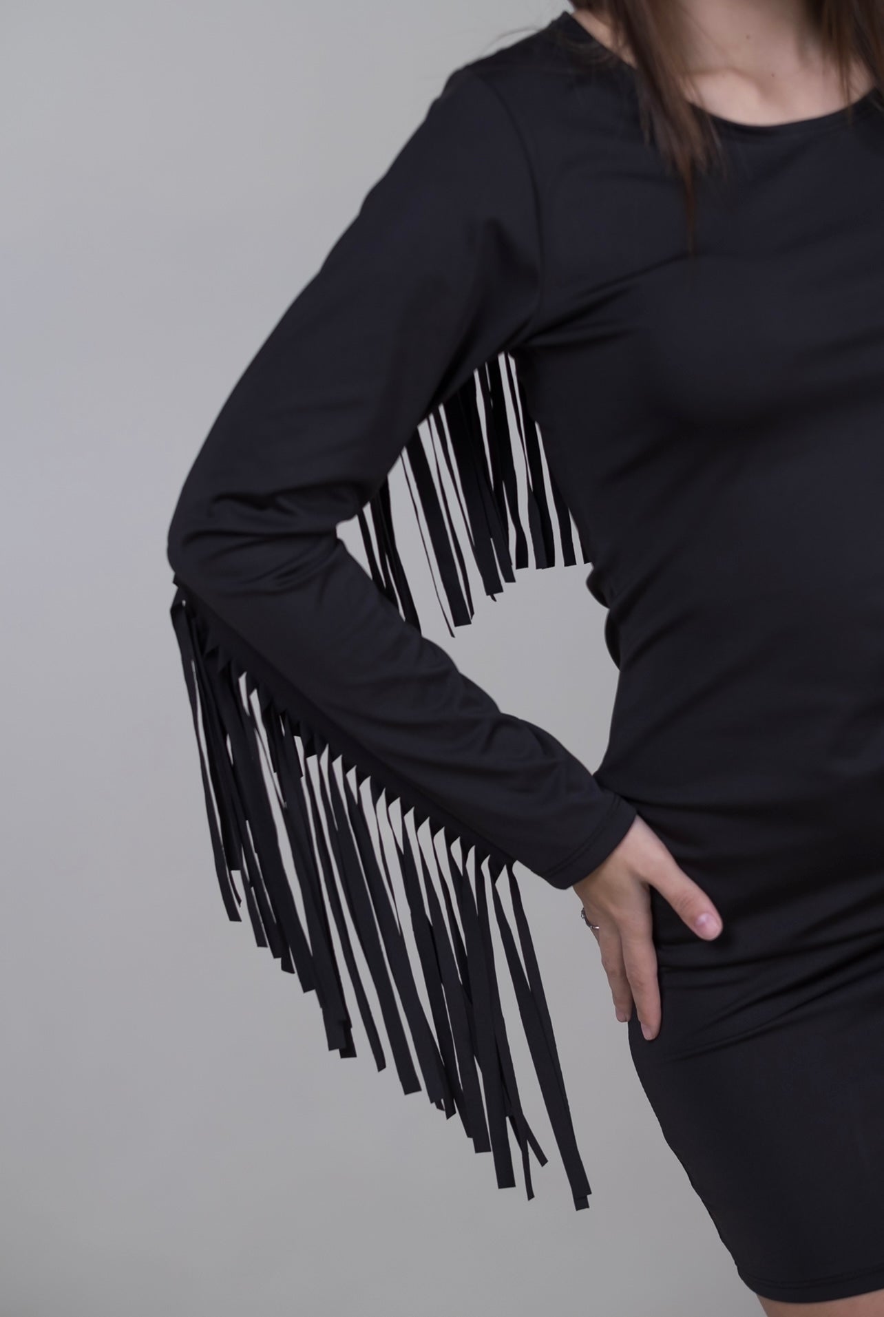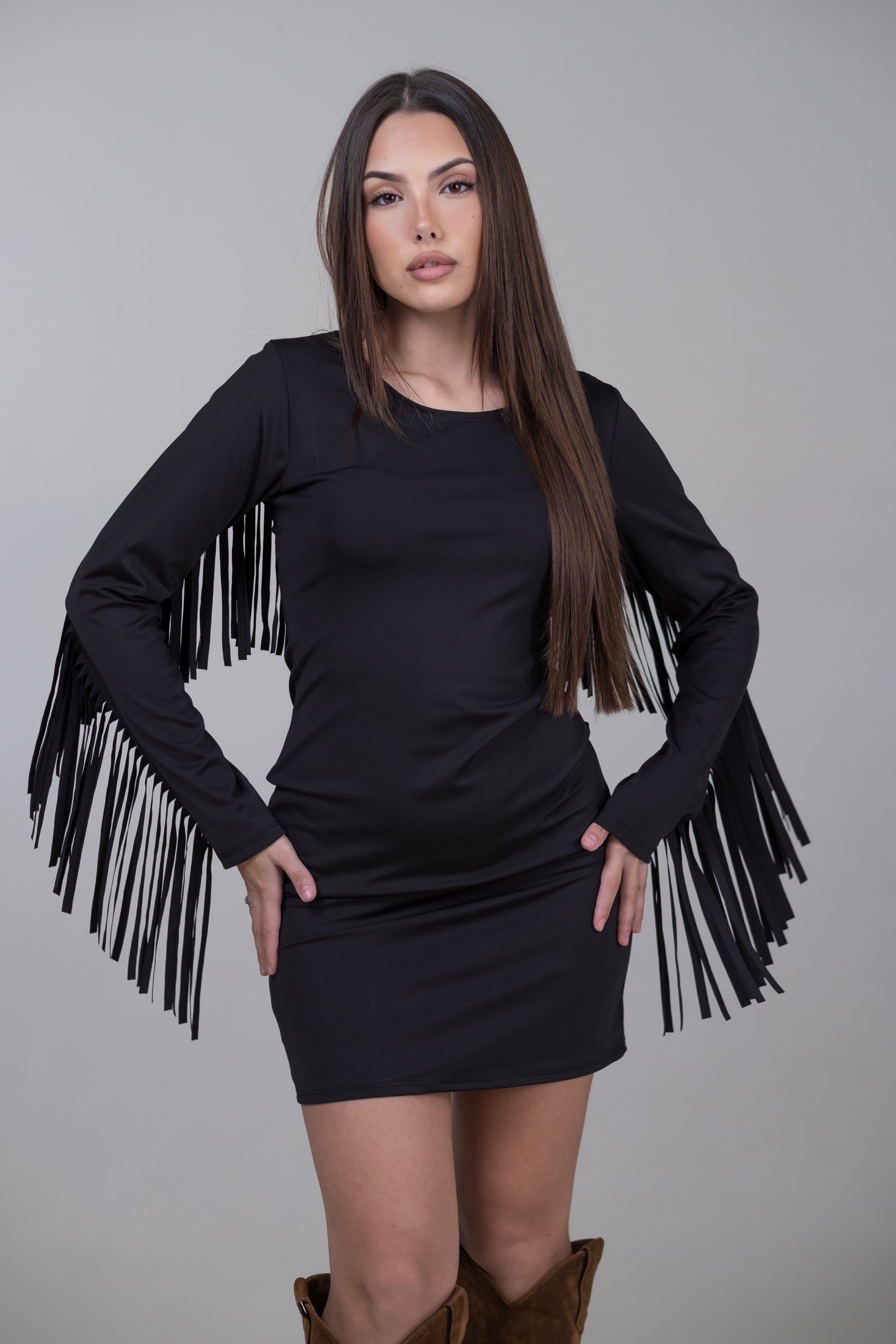 Abito aderente con frange.