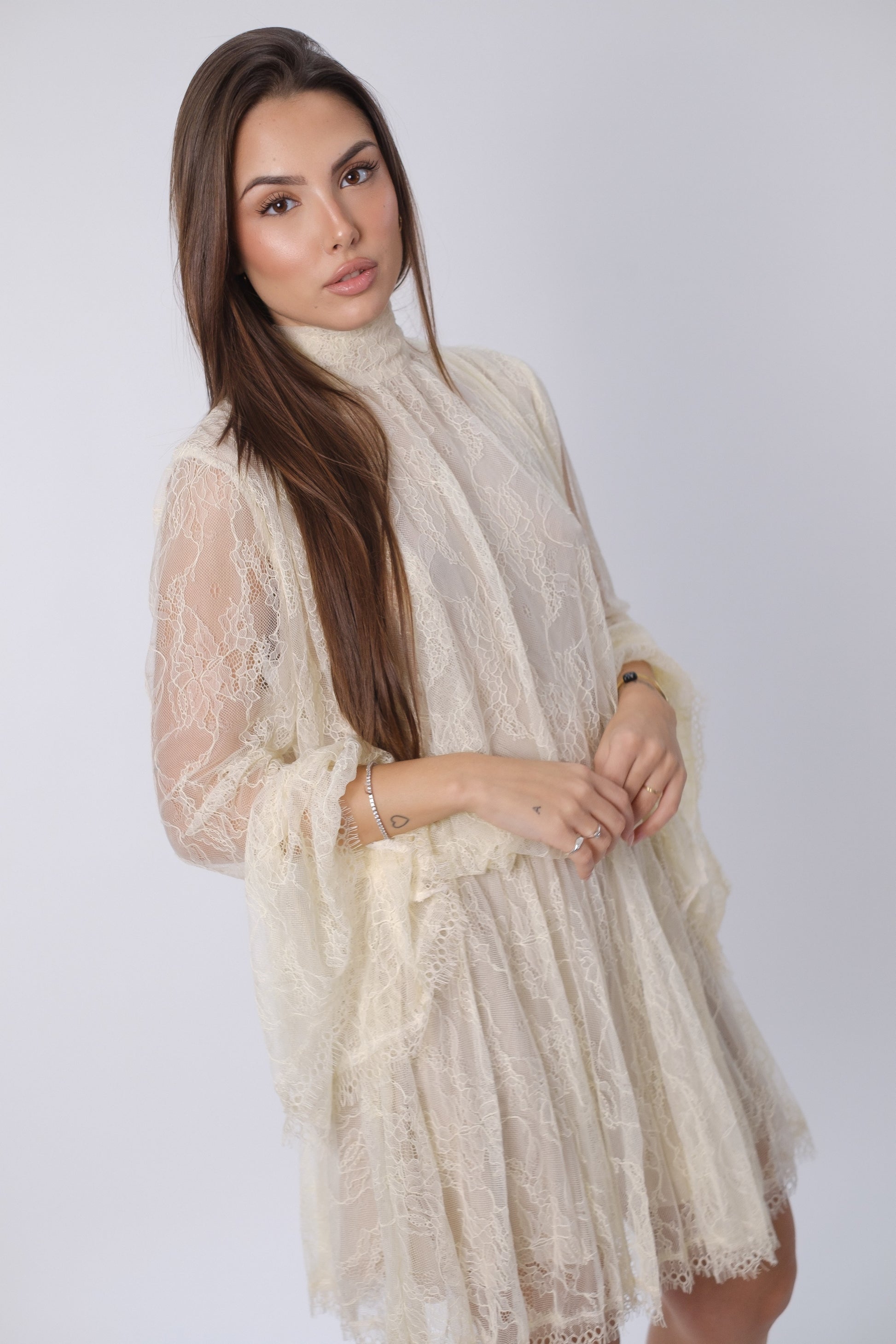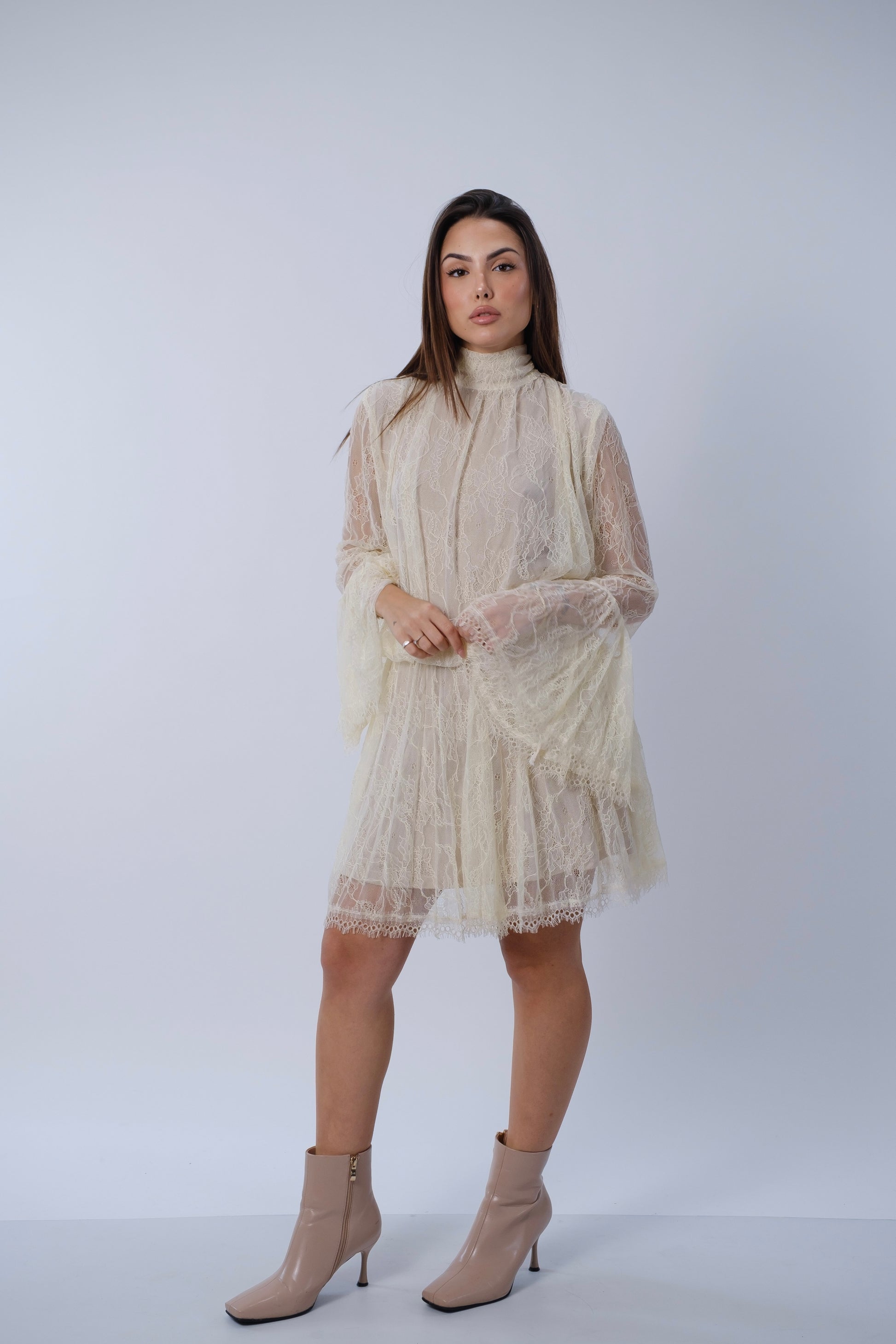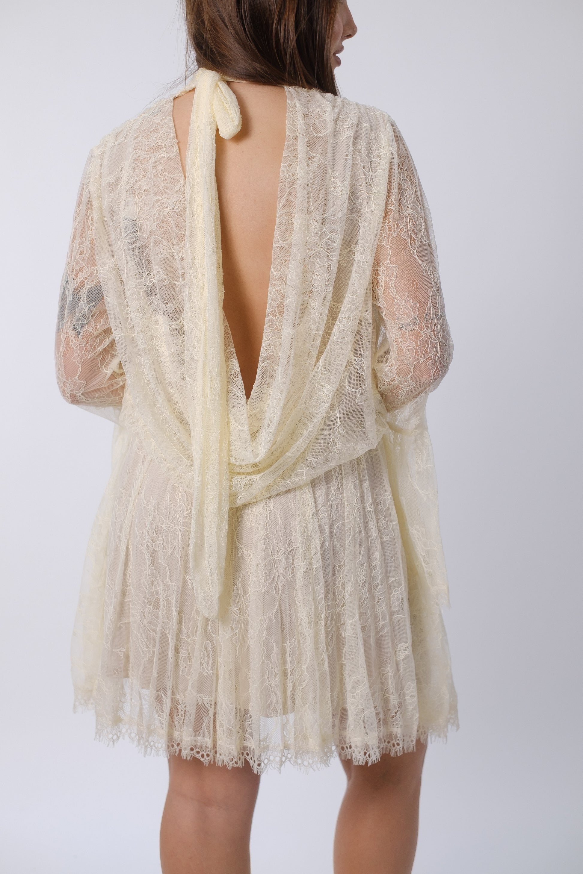 Abito in pizzo con scollatura posteriore.