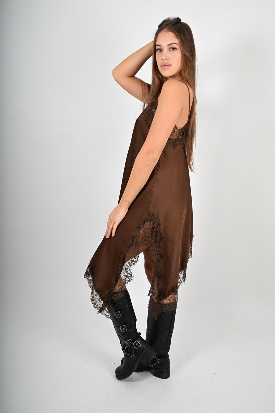 Abito asimmetrico in raso con scollatura e fondo in pizzo.