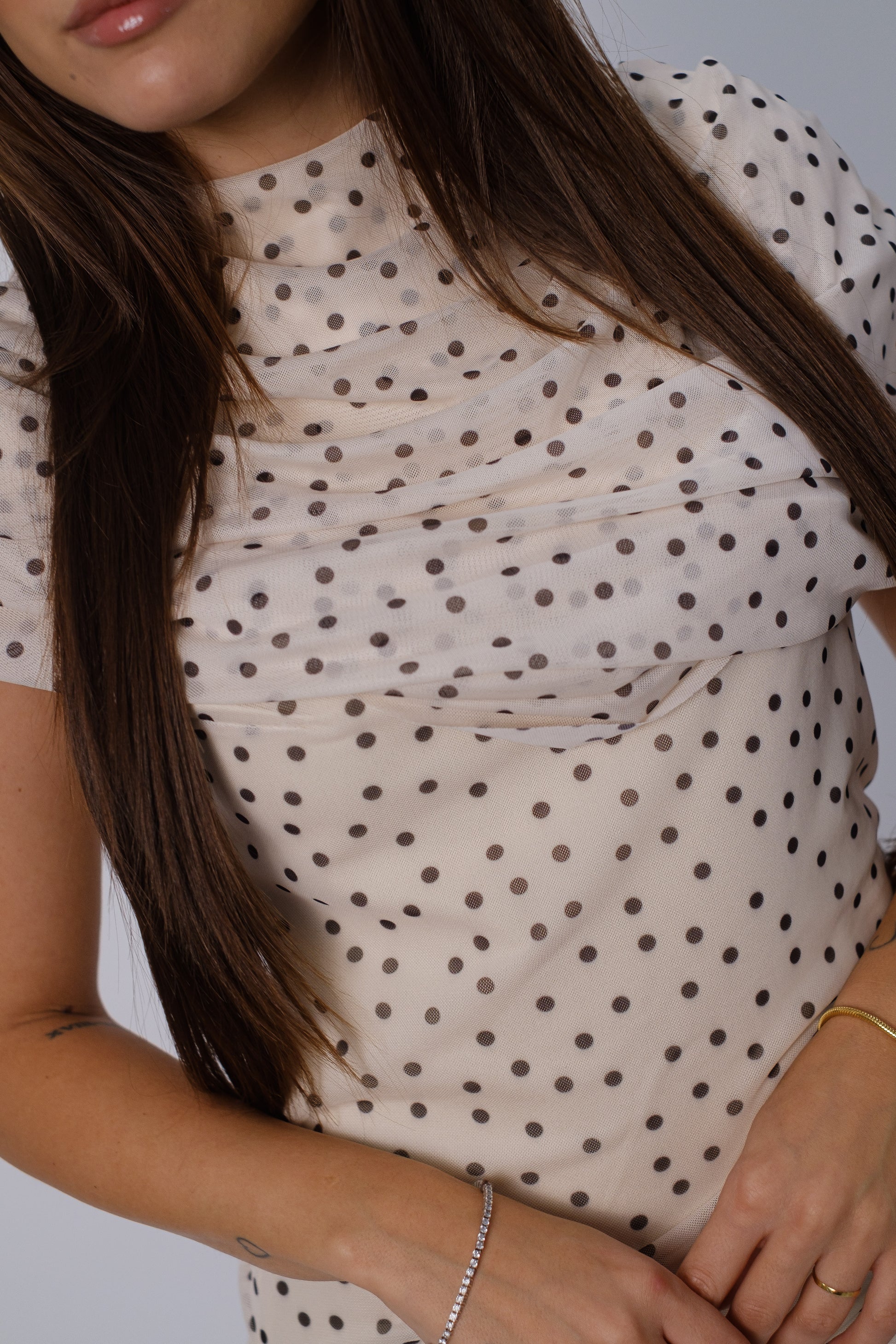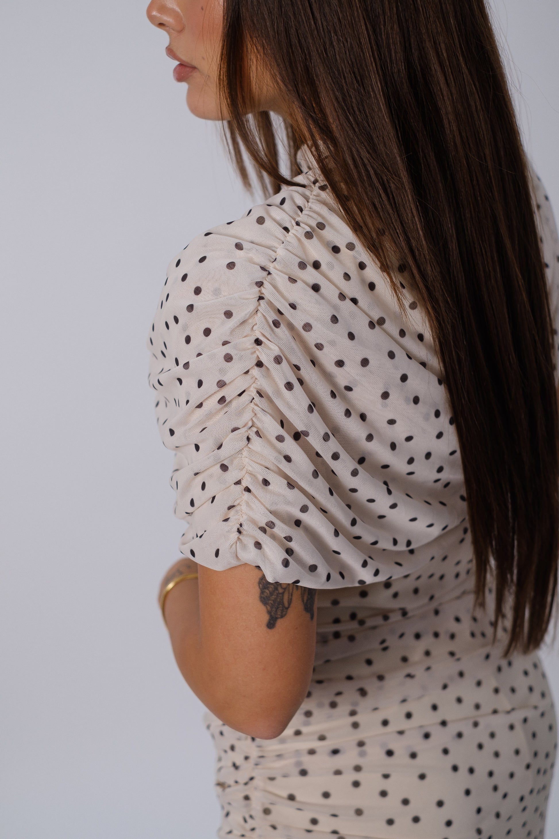 Abito tubino a púa in tulle con arricciature.
