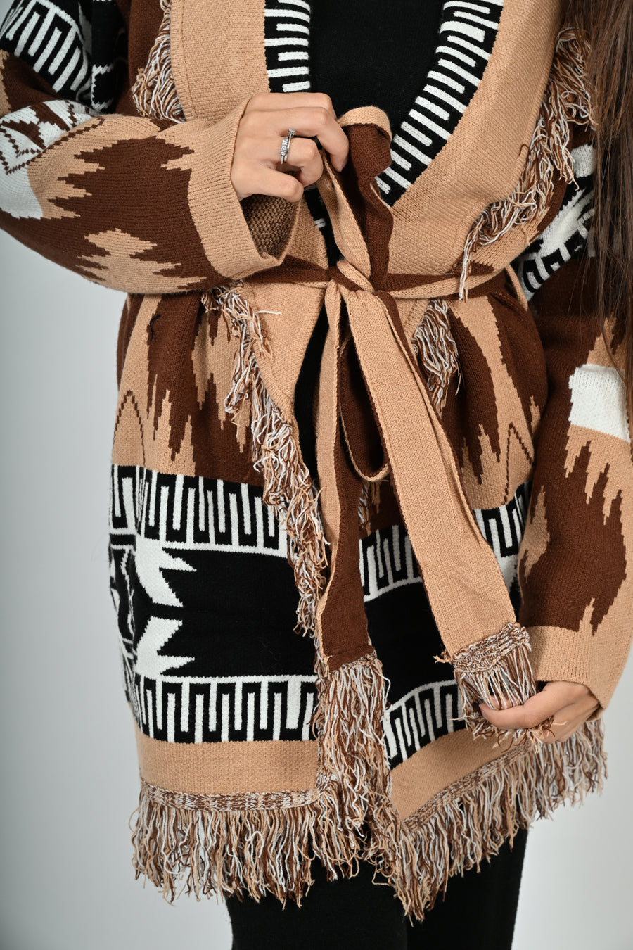 Cardigan in fantasia con frange, versione lungo, con chiusura a cintura integrata.