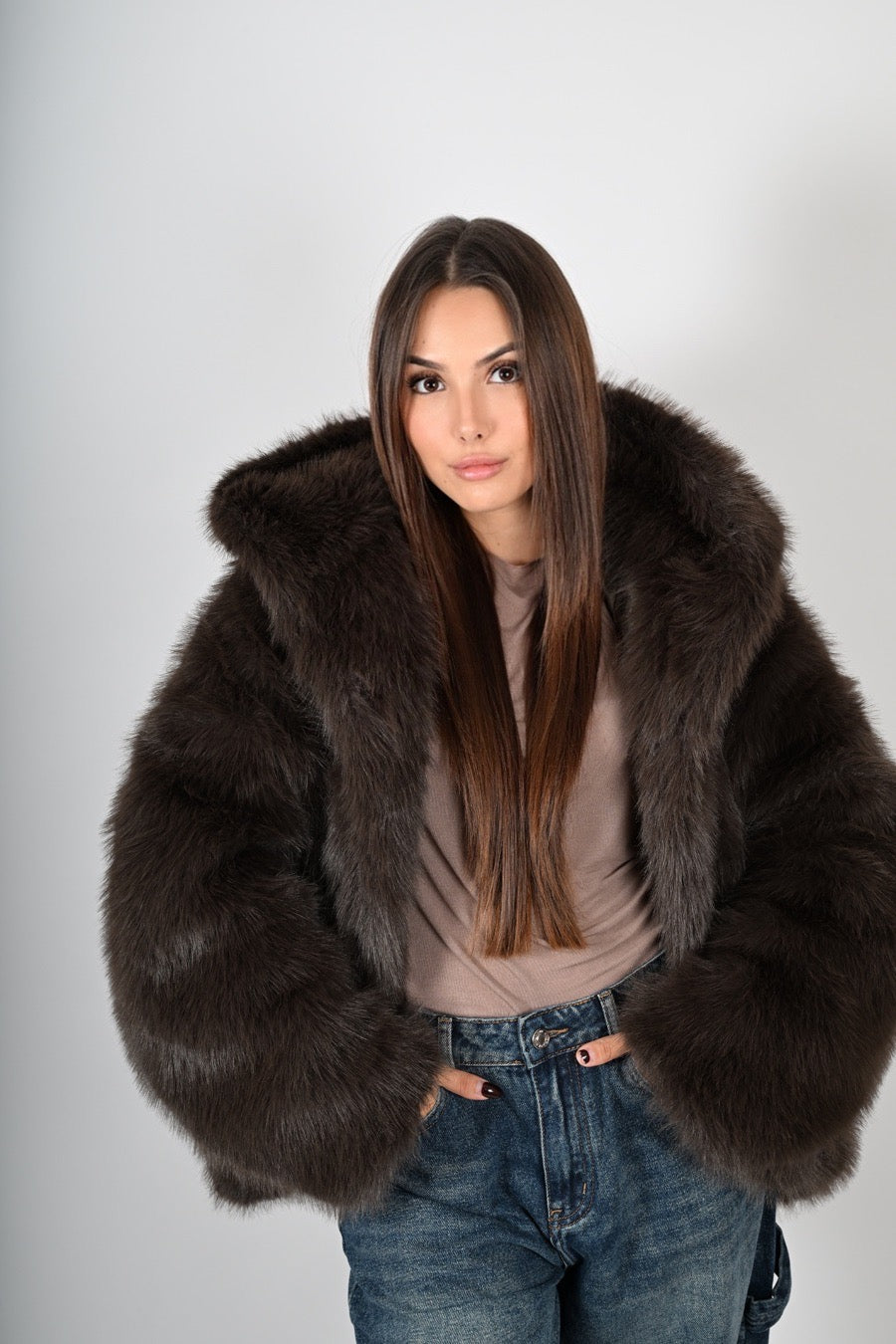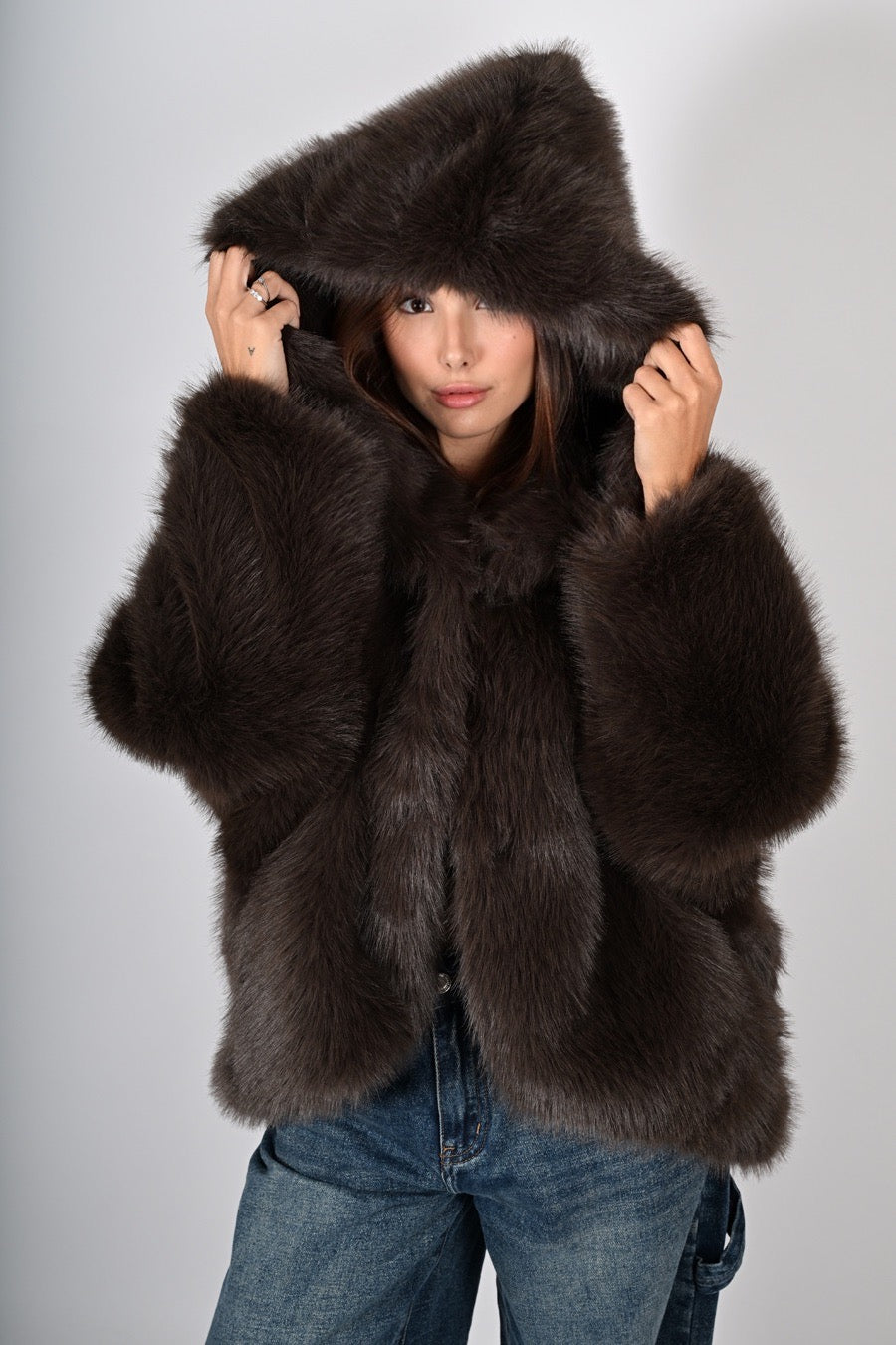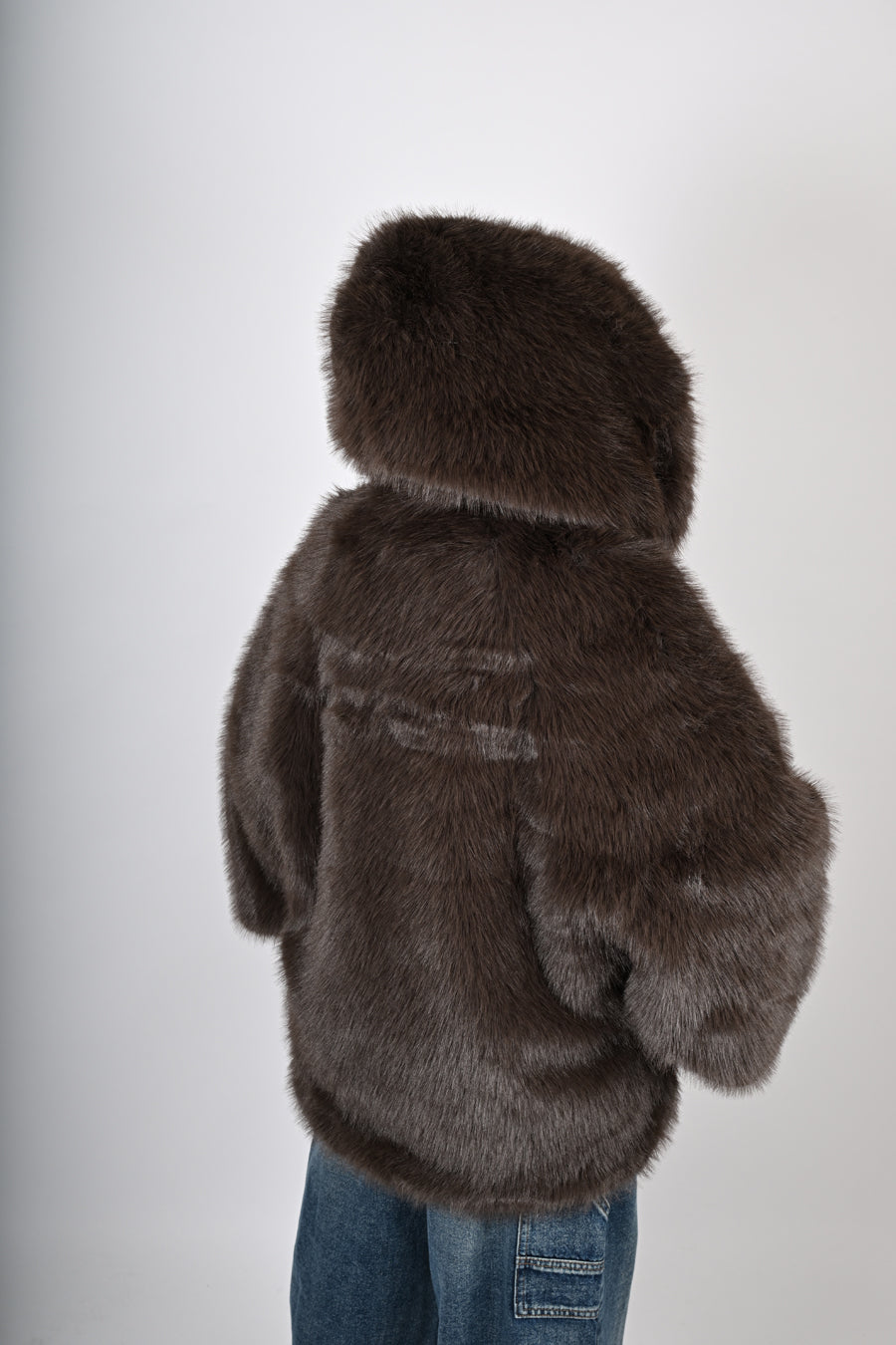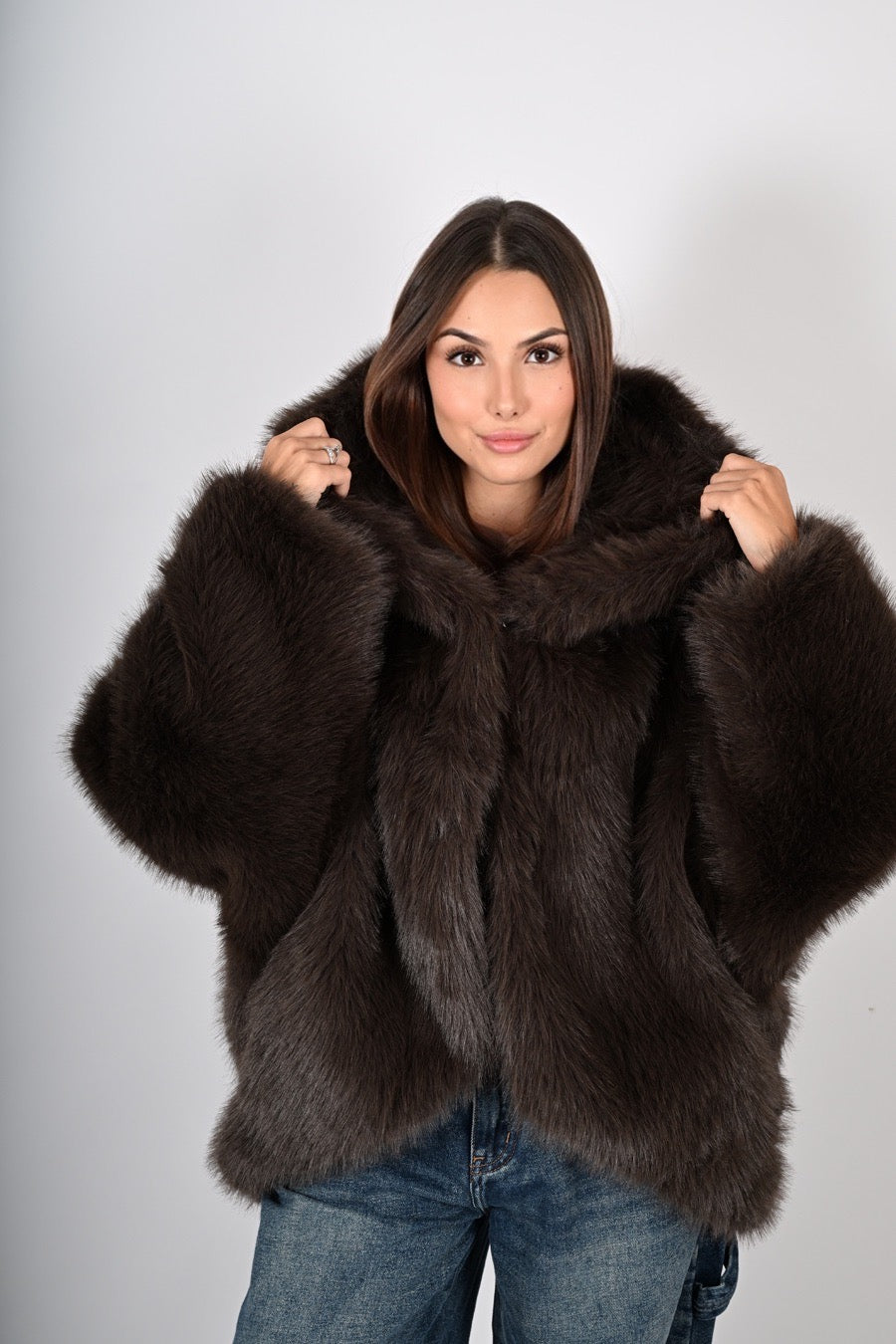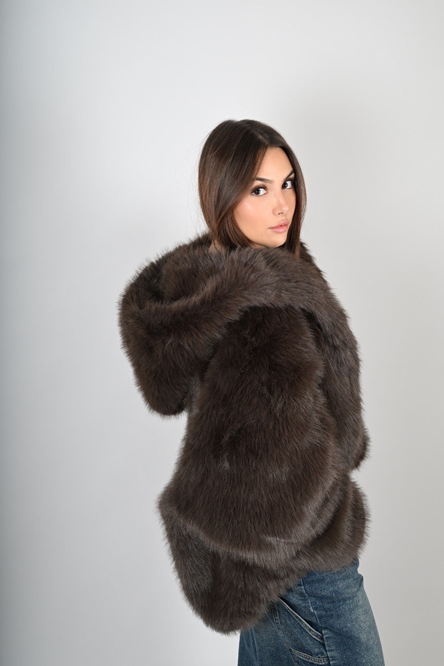 Eco-pelliccia con cappuccio e chiusura con bottone.