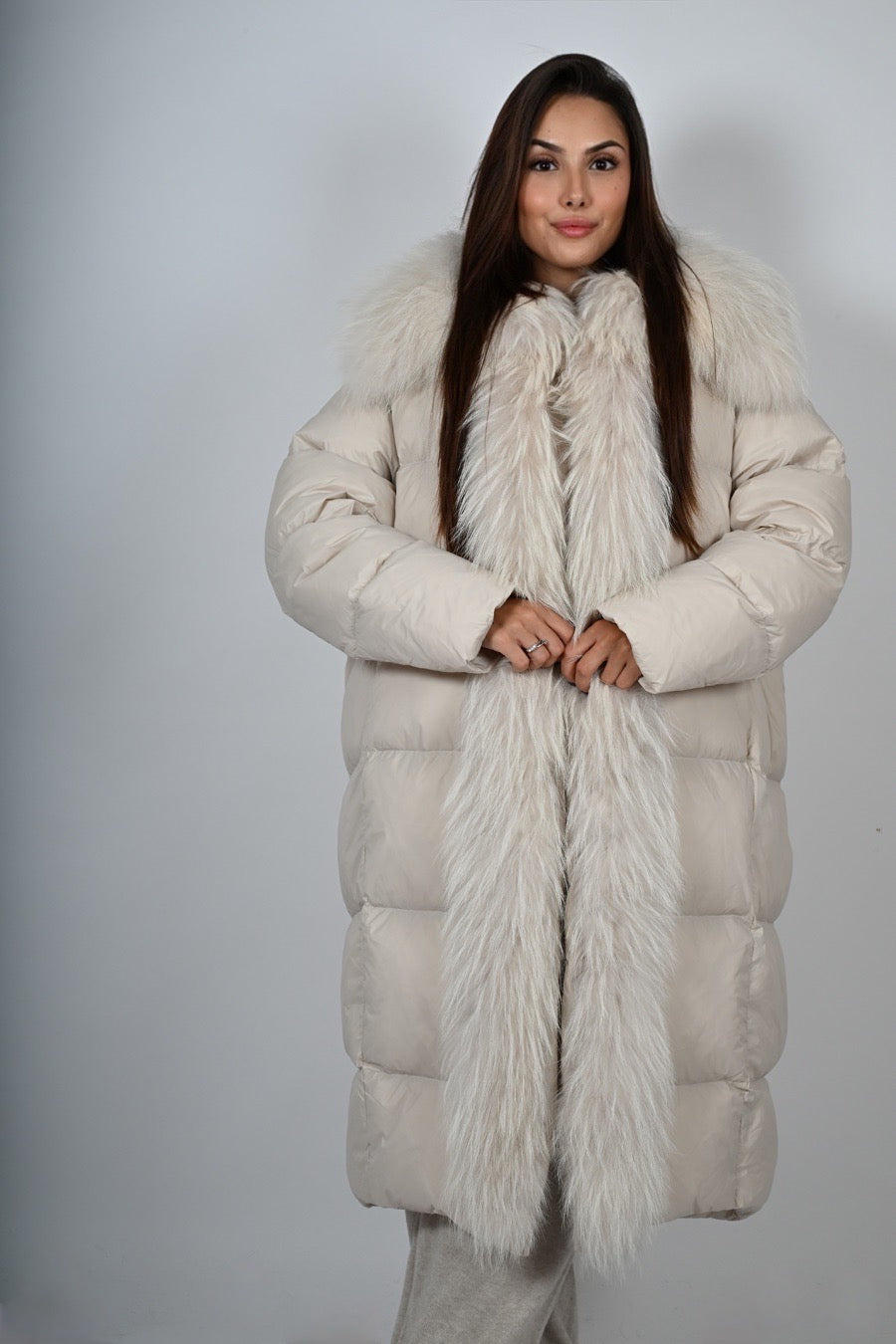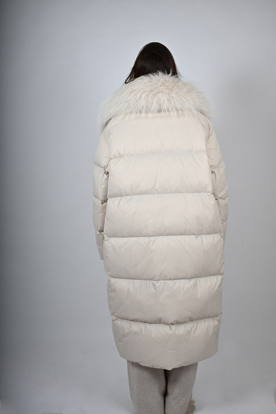 Piumino lungo imbottito con inserti, manica a polsino e applicazioni estraibili in pelliccia.