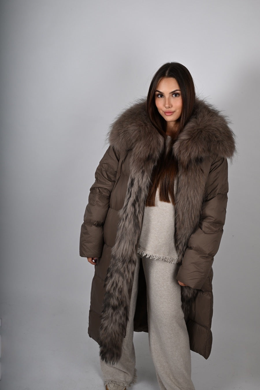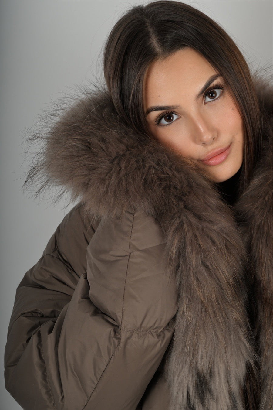 Piumino lungo imbottito con inserti, manica a polsino e applicazioni estraibili in pelliccia.