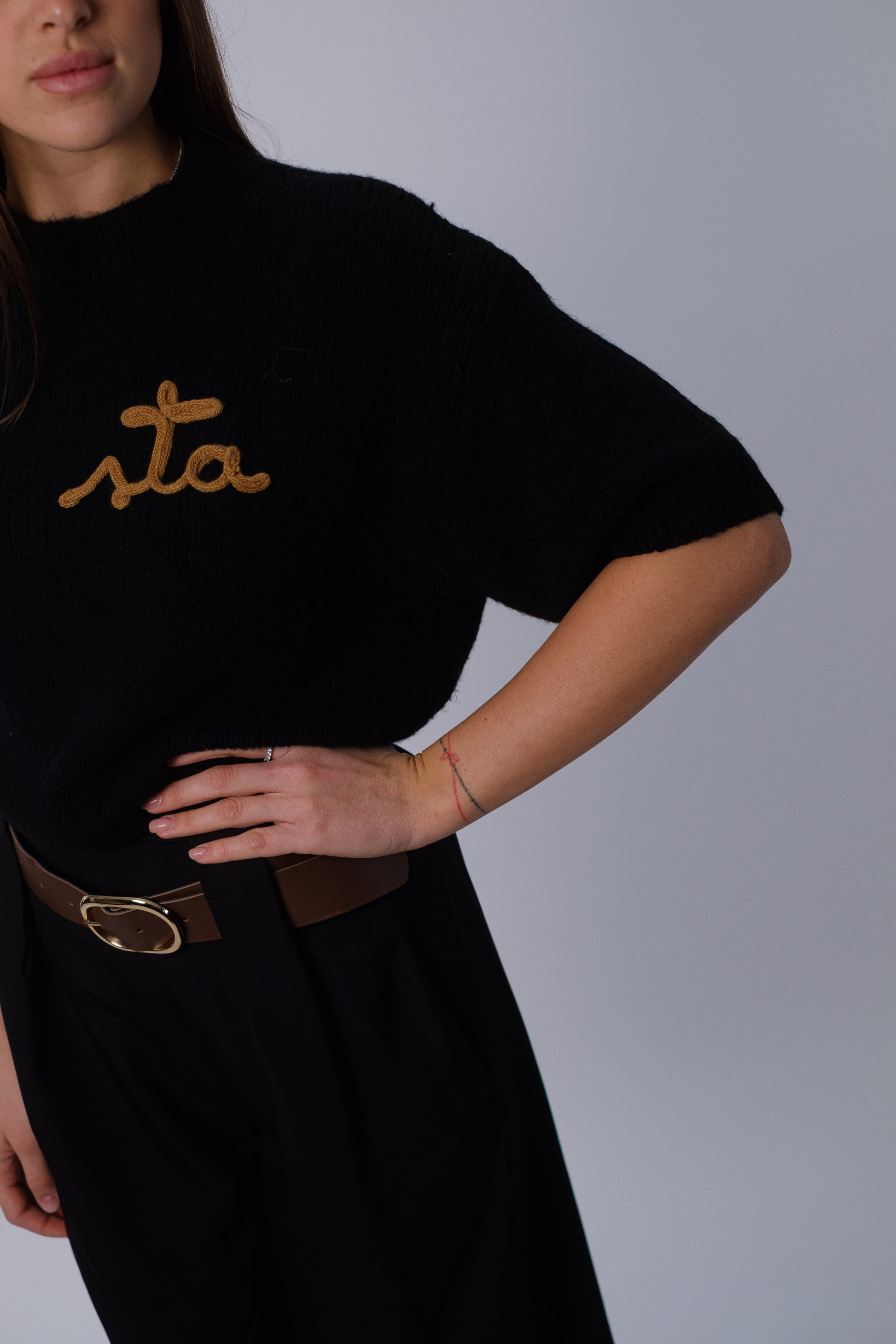 Pullover morbido con manica 3/4 e scritta ricamata in rilievo.