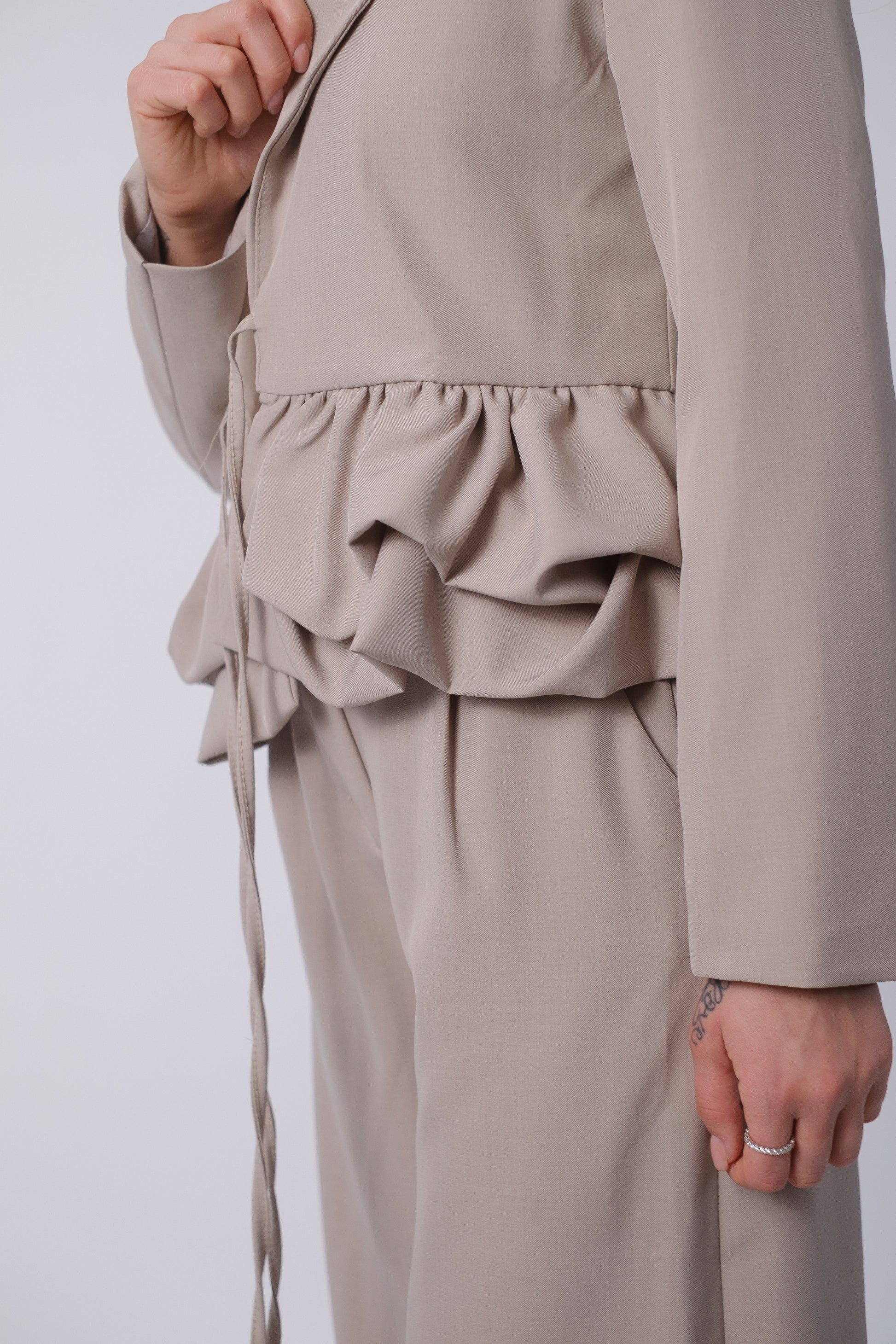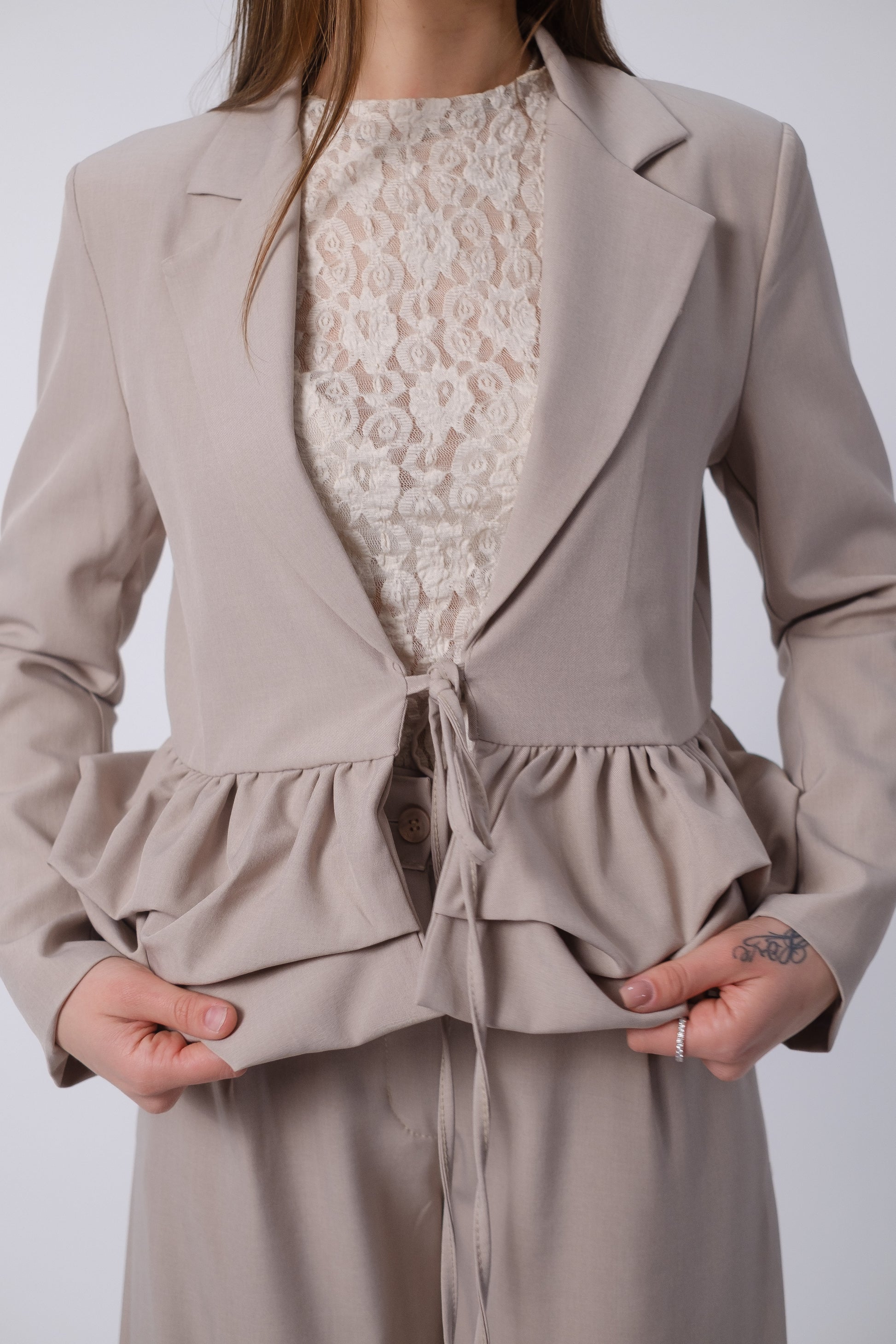 Tailleur strutturato caratterizzato da una chiusura a laccio e balze sulla parte superiore e pantalone dritto morbido elasticizzato con chiusura a bottone.